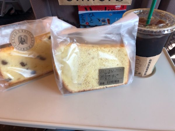 いつも通りスタバに寄ります。コーヒーのお供兼朝ご飯は大分のお土産、シフォンケーキです。私のお気に入りのバナナとメープルナッツです。