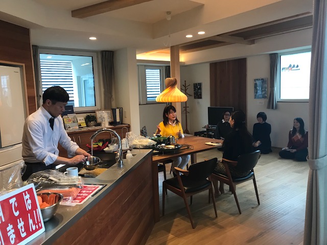 社員の塩野さんも初めて聞くプレゼンと目の前の実演に釘付けです。塩野さん、年頃ですから、花嫁修行にお料理の技術も含めて覚えてくださいね!