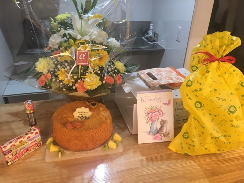 何だか変だなぁとは思いながら、鼻歌歌いながら〜♬階段降りていくと何と嬉しい事にみんなからのサプライズが待ってました。早苗さんの手作りシフォンケーキ、皆さんからのお花、ヘッドマッサージ、おやつと全て私の趣味嗜好をわかってくれてるものはがり!!ありがとうございます。