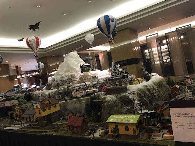 すっかり冬景色になったジオラマも健在です。ヒルトンは!いつも思考を凝らしたロビーのオブジェですが、毎年本当に頭が下がります。クリスマスツリーは何処でもあります。でも、このジオラマのクオリティは、地域の頑張ってる会社さんの広告宣伝もしてますから、ステキな企画だと思います。夢がありますからね〜^ ^^ ^