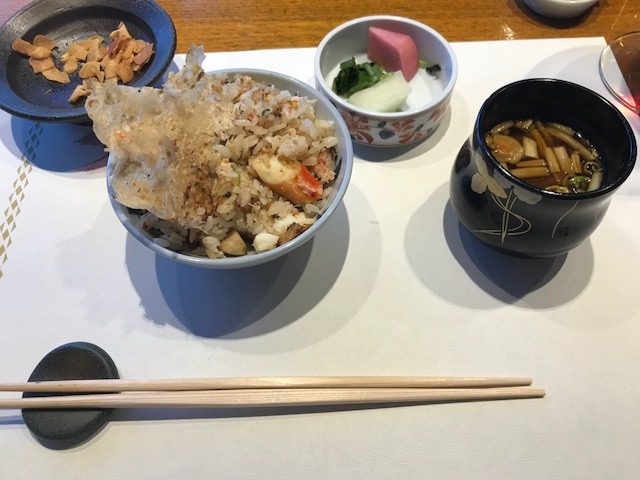 締めのガーリックライスとお味噌汁とお漬物〜。うーん最高です。しかもわかりますか?ガーリックライスに、まさかのタラバガニ、ズワイガニが入ってる料理長のダイナミック贅沢メニューです。