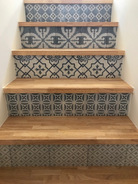 北欧調のイメージのデザインタイルかと思いますが、階段一段一段デザインが違います。