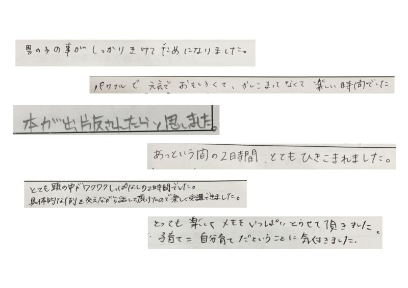 「とても楽しくメモをいっぱい取らせていただきました。子育て = 自分育てだということに気付きました。」
