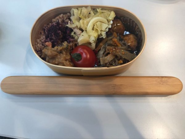 肉団子、きんぴらごぼう、トマト、野菜炒め、ゆかりご飯、とっ辛味噌です。