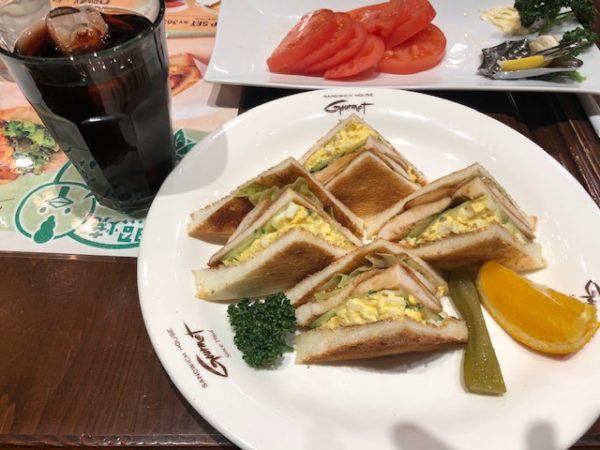 トマトスライス、照り焼きチキンと卵のホットサンド、アイスコーヒーです。