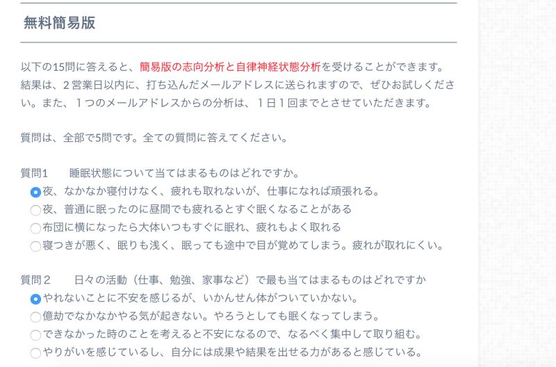 無料版では、5 つの質問に答えると、簡易版の志向分析と自律神経状態分析を受けることができます!